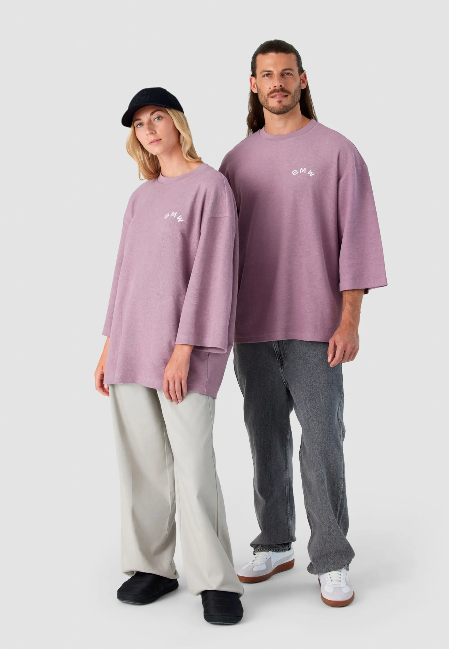 100% organic cottonWeight: 340gsmOversized fitArched BMW wordmark2.5cm rib collar