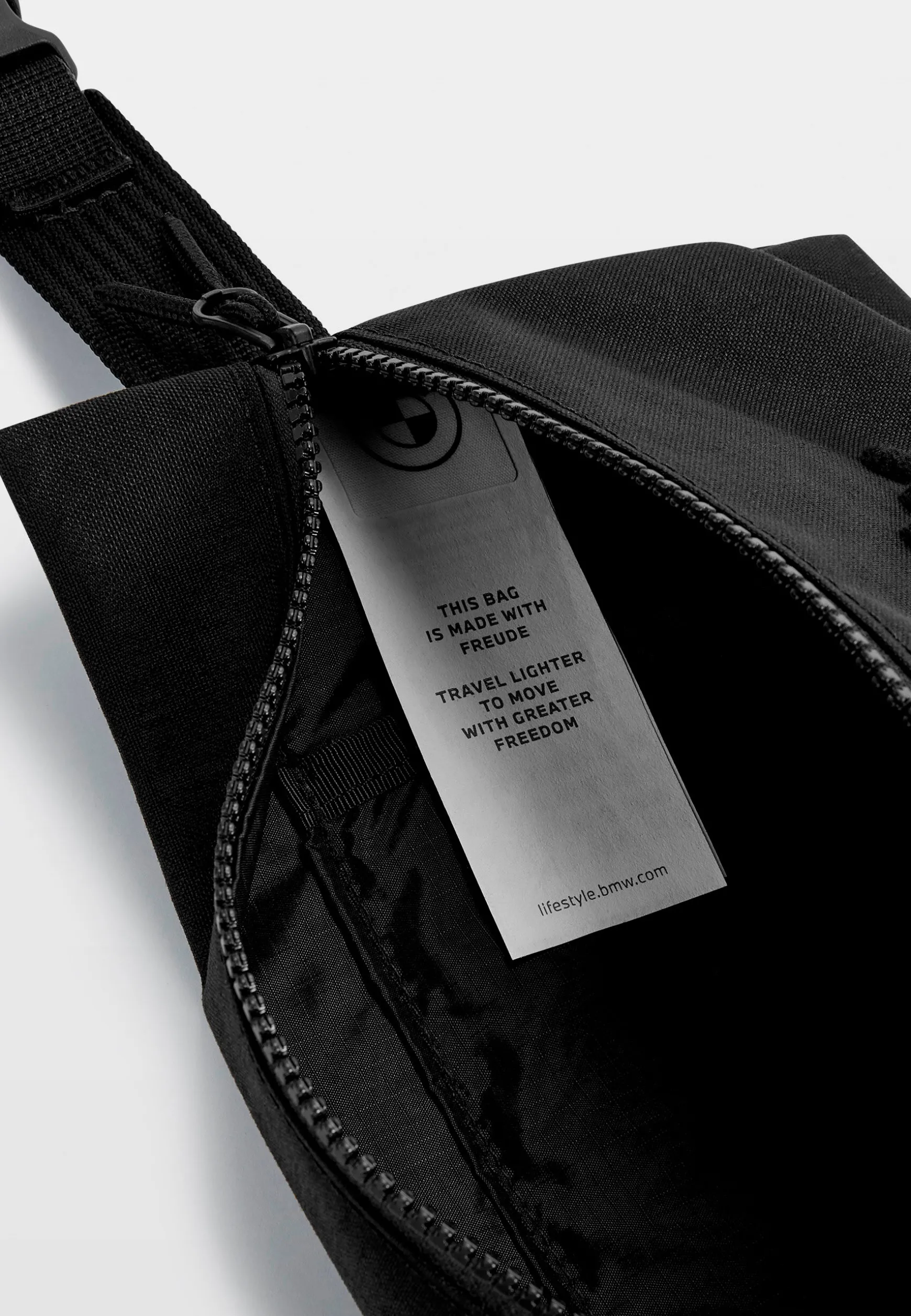 100% nylonArched BMW wordmarkYKK Vislon zippersAdjustable handlestrapCapacity: 2L