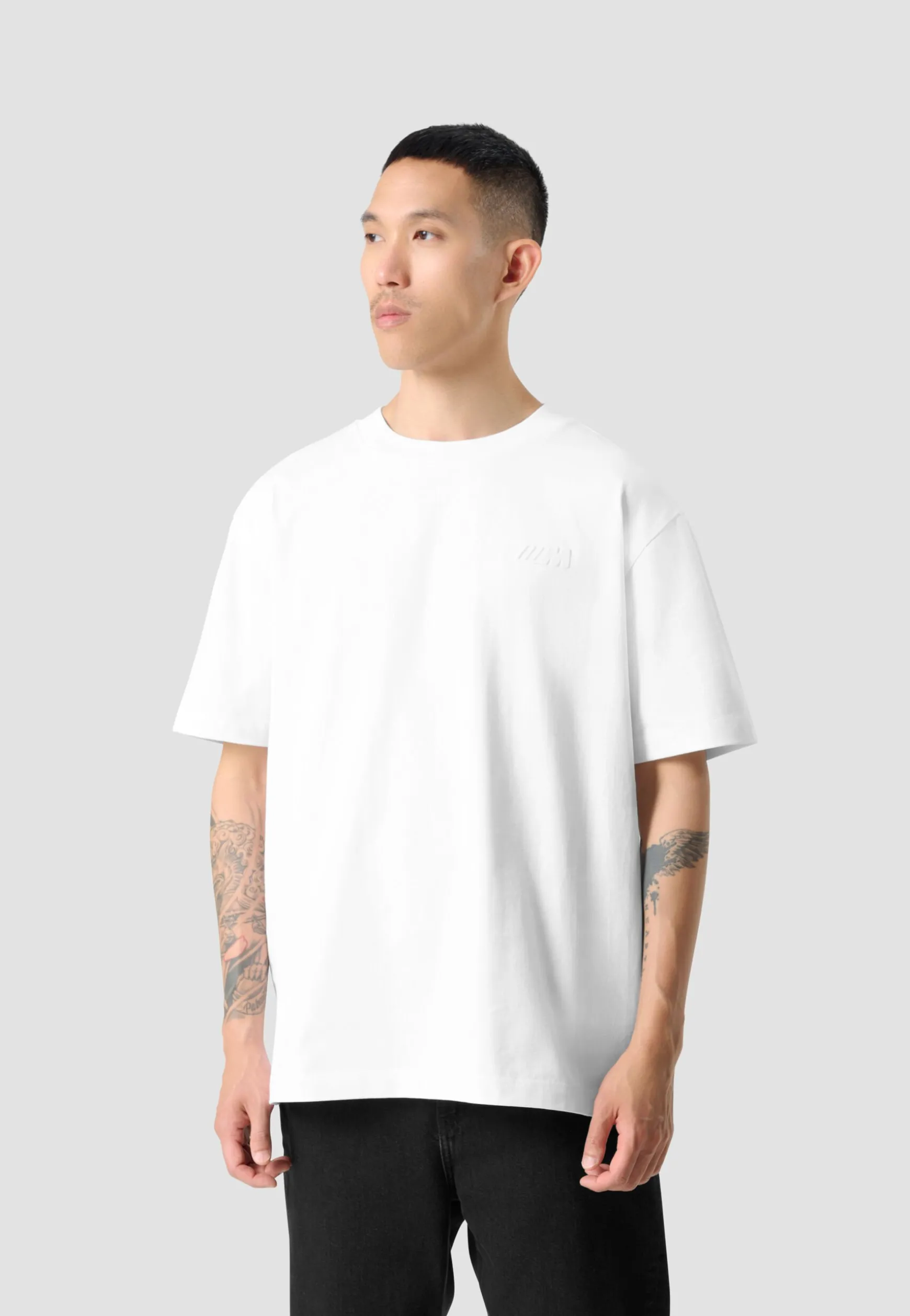 100% organic cottonWeight: 270gsmOversized fitEmbossed M logoShort sleevesRibbed collar