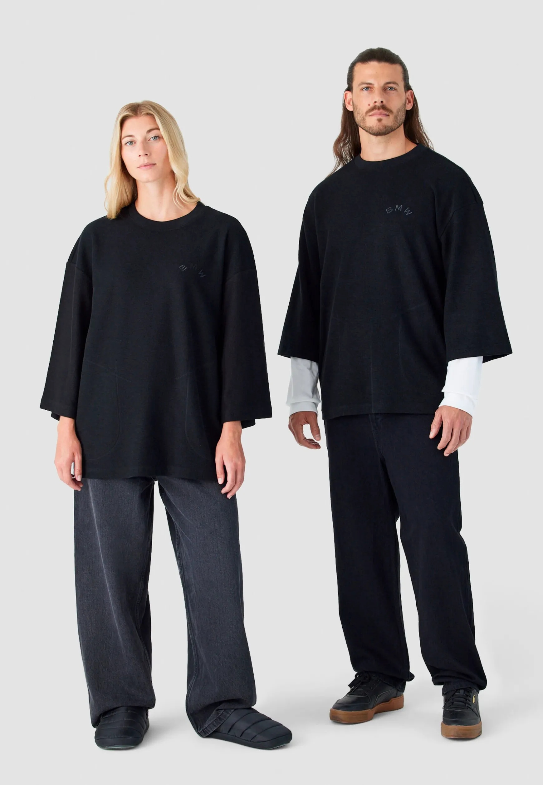 100% organic cottonWeight: 340gsmOversized fitArched BMW wordmark2.5cm rib collar